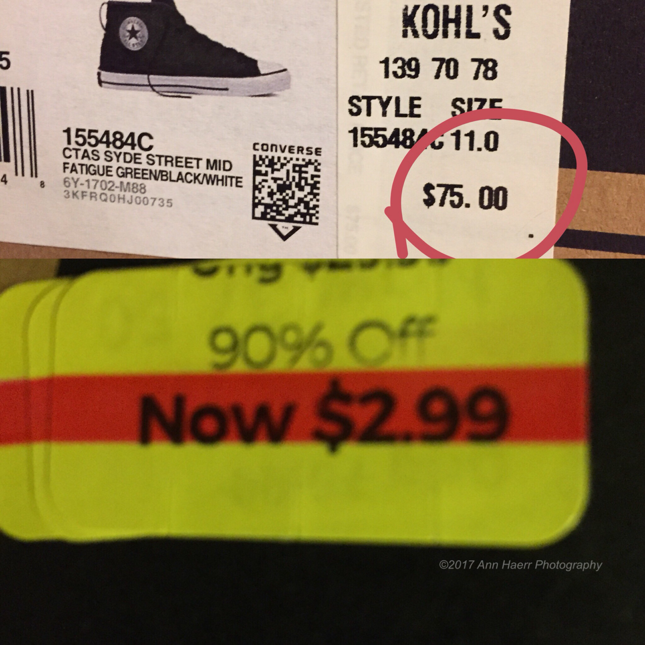 When we got to the register, I asked about it again and said what the shoe department man had said. With no question, the manager came and authorized the price. So Kevin got a brand new pair of $75.00 Converse high-tops which were on sale for $15 for $2.99.